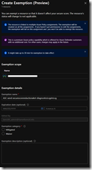 Then fill up the exception creation details, including an optional expiration period and the mandatory exemption category to define for which reason you want to exclude the resource