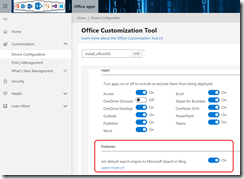 If you use SCCM to deploy your Office 365 Pro Plus, update the Set default search engine to Microsoft Search in Bing setting available under the Features section